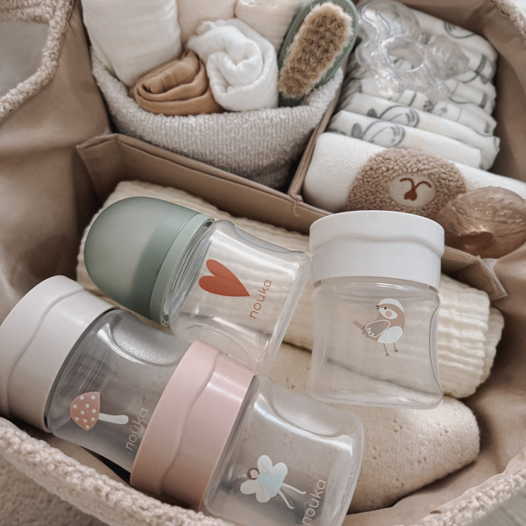 This set includes four storage containers, each with its own airtight, leakproof lid for easy storage. These containers are designed to fit the included nipple and hygienic cap, so you can prepare milk in advance and store it in the extra containers. When it’s time to feed your baby, simply switch the lid for the nipple and hygienic cap, making it easy to transition from storage to feeding. They’re also compatible with noüka’s transitional baby bottles for added flexibility. Made from safe, durable materials, these 2-in-1 containers are BPA, PVC, and Phthalates-free for your peace of mind.