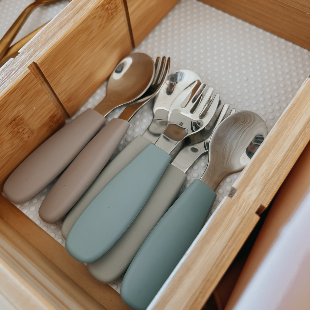Self-feeding is simple and safe for little ones with noüka’s Toddler Cutlery Set. This set includes a fork and spoon with smooth edge design for safety. The soft silicone handle allows for a comfortable grip as they practice self-feeding. Made from food grade silicone and stainless steel that is dishwasher safe, our dinnerware set is easy to clean, durable, and long-lasting. The Toddler Cutlery Set is available in an array of calming, modern colors for your little one.